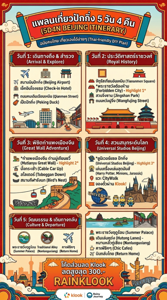แจกแพลนเที่ยวปักกิ่งด้วยตัวเอง 5 วัน 4 คืน อัปเดตล่าสุดปี 2026 เที่ยวจีนฟรีวีซ่า เก็บครบทุกไฮไลท์ Universal Studios Beijing ทัวร์กำแพงเมืองจีน พระราชวังต้องห้าม พร้อมโค้ดส่วนลด Klook กรอกโค้ด : RAINKLOOK